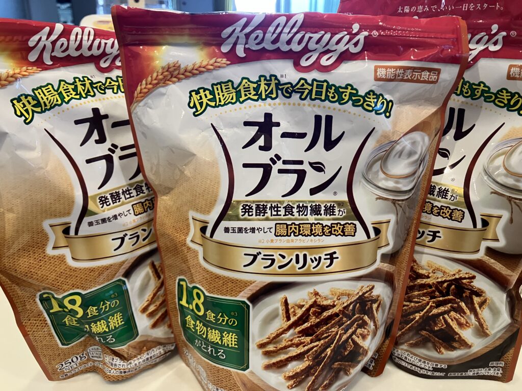 我が家の朝食は、ケロッグ製品の消費量が高い。娘は「チョコワ」が好きで、私は「オールブラン・ブランリッチ」をよく食べている。私の理由は便秘の解消。数年前から加齢による食事の変化で脂質を摂る量が減ると、酷い便秘体質になってしまった。便秘薬を多用したくないので腸内環境を整えようと、発酵食品や食物繊維の多い食材を多く摂るようにしていたが、効果はイマイチ。シリアルも数社の製品を試したところ、オールブランシリーズを食べると便通が良くなる事を発見し、最終的にブランリッチに辿り着いた。