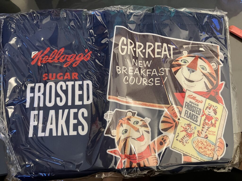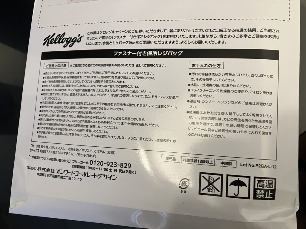 夏のある日、購入品した商品のパッケージの裏にプレゼント・キャンペーンの記載を発見。応募方法は、ケロッグ製品を購入したレシートを写真に撮ってwebで申し込むだけ。このバッグのデザインが気に入ったため、私も応募することにした。
