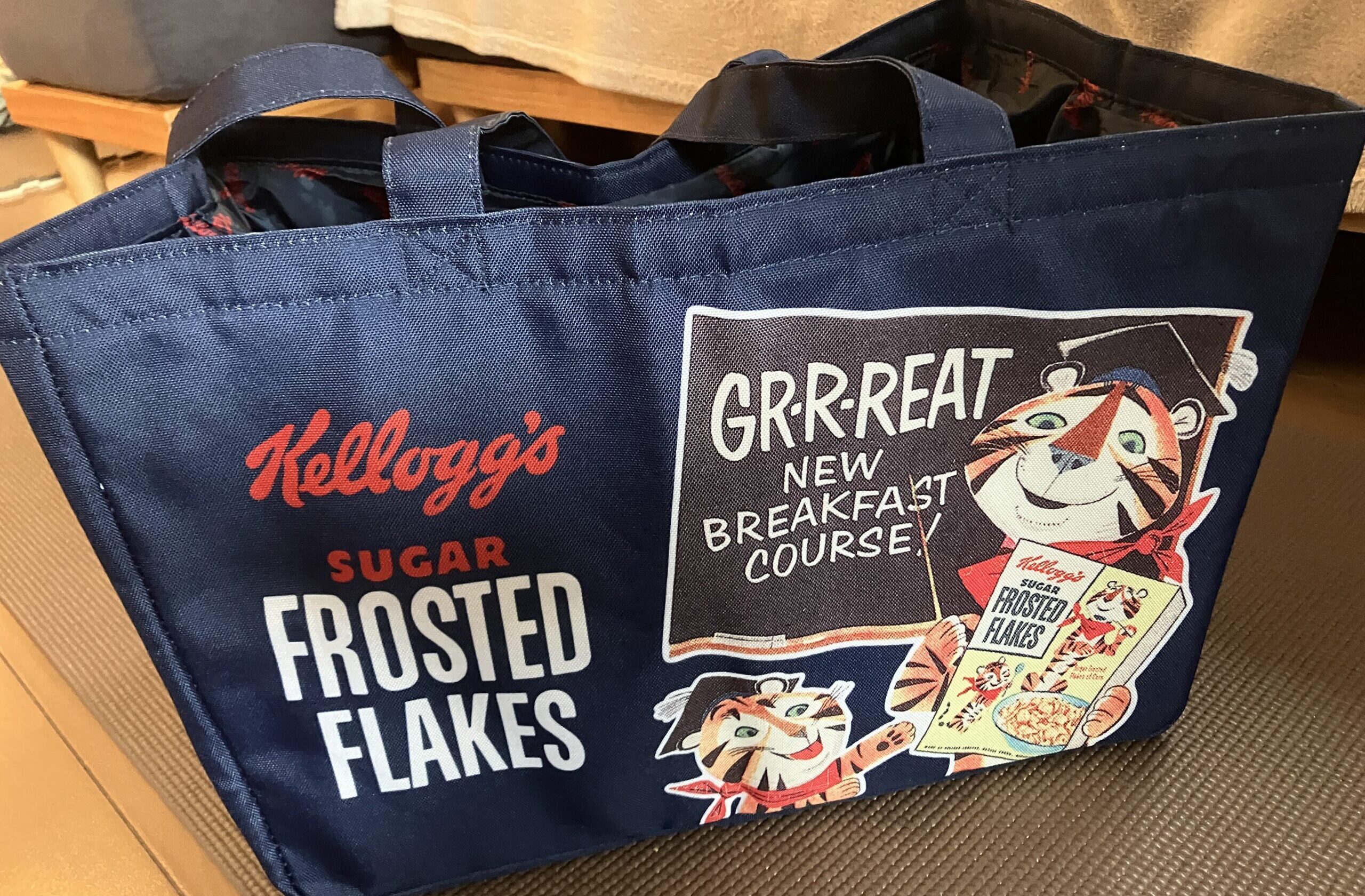夏のある日、購入品した商品のパッケージの裏にプレゼント・キャンペーンの記載を発見。応募方法は、ケロッグ製品を購入したレシートを写真に撮ってwebで申し込むだけ。このバッグのデザインが気に入ったため、私も応募することにした。