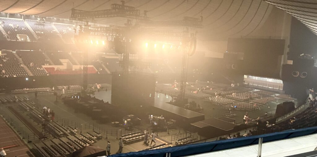 2階席の斜め後方に座席だった。この規模の会場では肉眼で観るのは厳しいとは思っていたが、方向的にも見え難いボジション。四方の柱でステージ中央が視覚になり、大型ビジョンも斜め45度。残念ながら没入感は得られなかった。同じ事を感じたのか、私の周辺の席は大人しく鑑賞している観客ばかりだった。とは言え、会場全体を見回して広さを実感すると「この規模でライブするのか〜」と感慨深くなった。