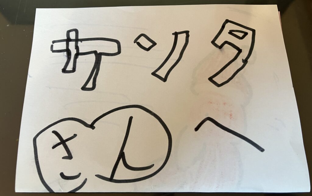 イブの夜、寝る支度をしてベッドに向かう直前になると「やっぱりサンタに手紙を書く!」と言い出して、慌てて書き始めて、クリスマス・ツリーの根本に置いていた。急に不安になったのだろう。娘を寝かしつけてから手紙の内容を確認すると、希望のオモチャは用意してあった物だったのでホッとした。しかも「安いヤツで良いです」と書いてあったので、子供ながら健気だなと感じたが、やはり気が付いてるか?という疑念は払拭できなかった。