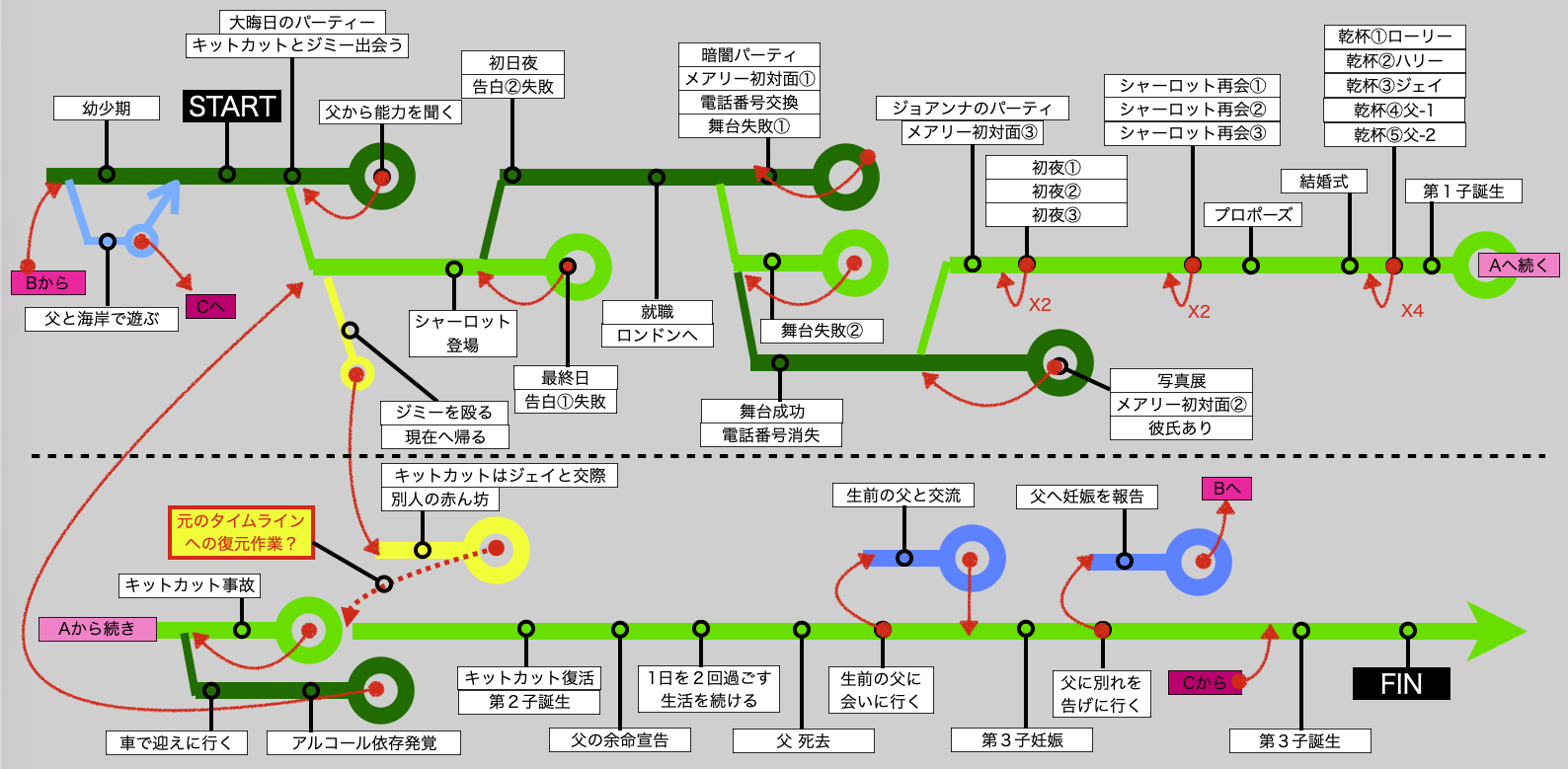 決定的なのはキットカットの事件だ。妹のために過去に戻り歴史を改変したが、その余波で自分の子供に影響が及んだ事が分かると、改変そのものを帳消しにした。この選択は仕方ないとしても、この顛末の中で妹本人の意思は十分に確認したのだろうか?と疑問に思う。