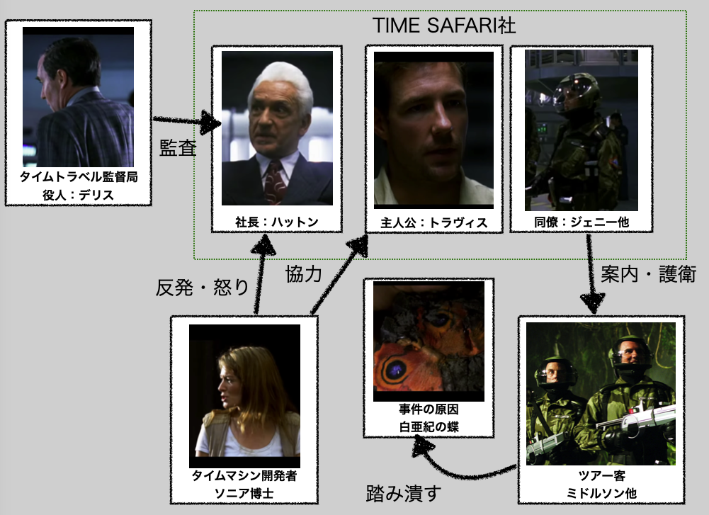 物語のプロットはシンプルで「過去の事象に干渉したことにより歴史を変えてしまい、再び過去へ戻り修正する」という王道パターンだ。しかし、上映時間の大半はサバイバル・アクションになっているので、タイムトラベル映画としての面白味は欠ける。そもそも原作は、歴史修正せずにタイムトラベルから帰還した者のブーツに蝶の死骸を見つけた所で終わるので、無理もないか。そういえばタイトルである「雷のような音」の意味も映画では回収していない。