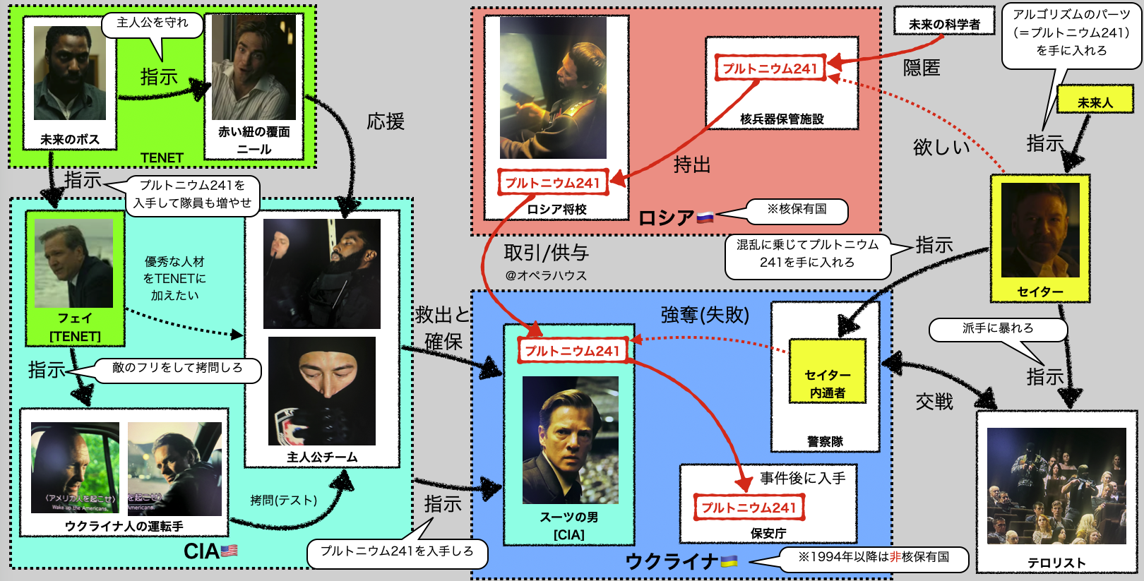 フェイ:事件後に登場するフェイはCIA職員でありなら、主人公をTENETへ勧誘するスカウトマンである。オペラハウス事件における味方勢力側の実質的な黒幕と言える。米国CIAとしての表向きの目的は、核弾頭に使われるプルトニウムの回収だったと推察する。