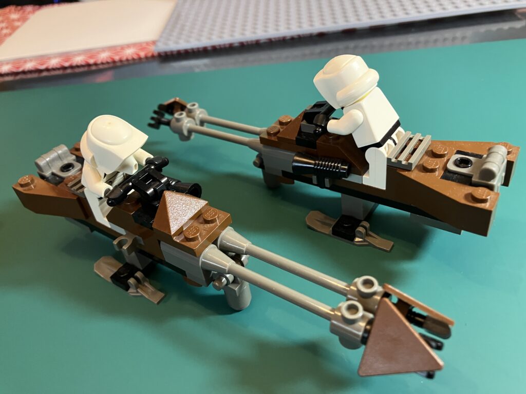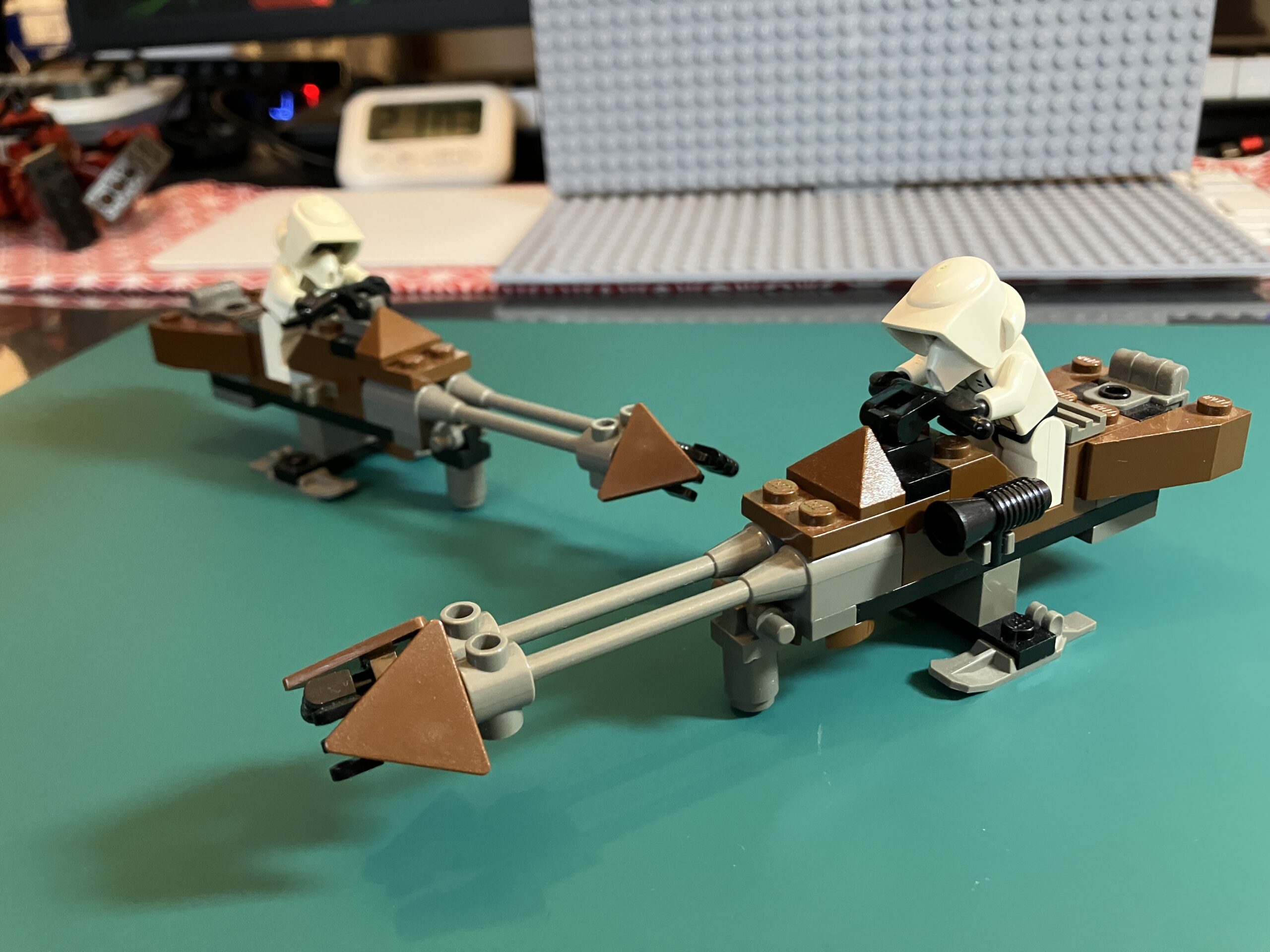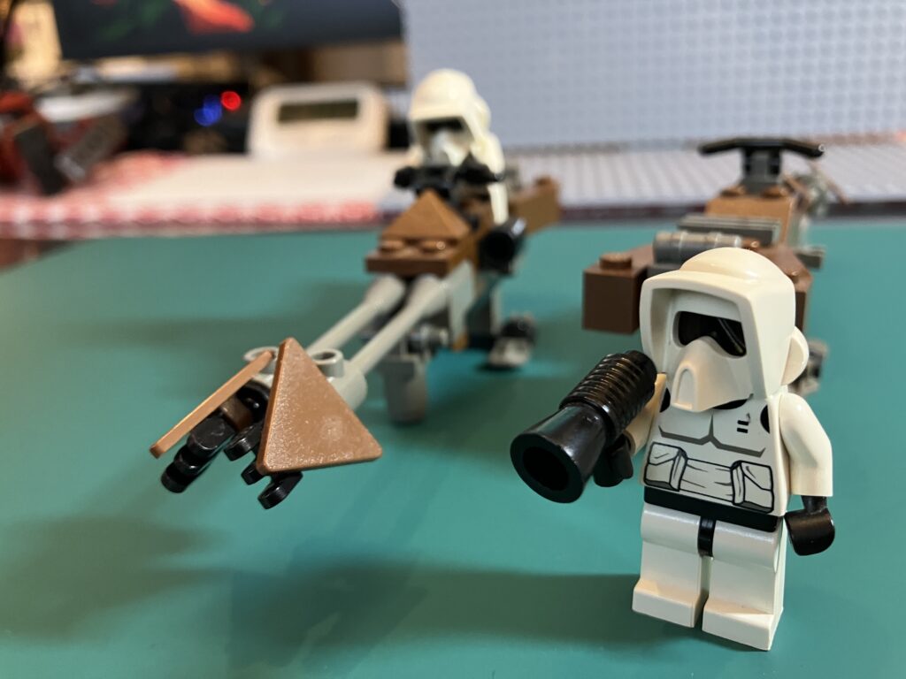 LEGO:帝国軍のスピーダー・バイク 玩具 2025.07.272025.11.06 1999年に生まれて初めて買った既製品。 組み立て説明書 - ダウンロード組み立て説明書 - ダウンロード 古いため、所々パーツが欠けている(^^;)。 ストーム・トルーパーのミニフィグも経年で黄ばんできた…。 お気に入り度 ★★☆☆☆