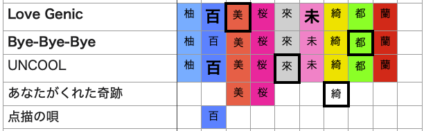 表注釈:色付=歌唱パートあり(サビ除く)、太字=歌唱パート多め、太枠=センター(または中心的存在)