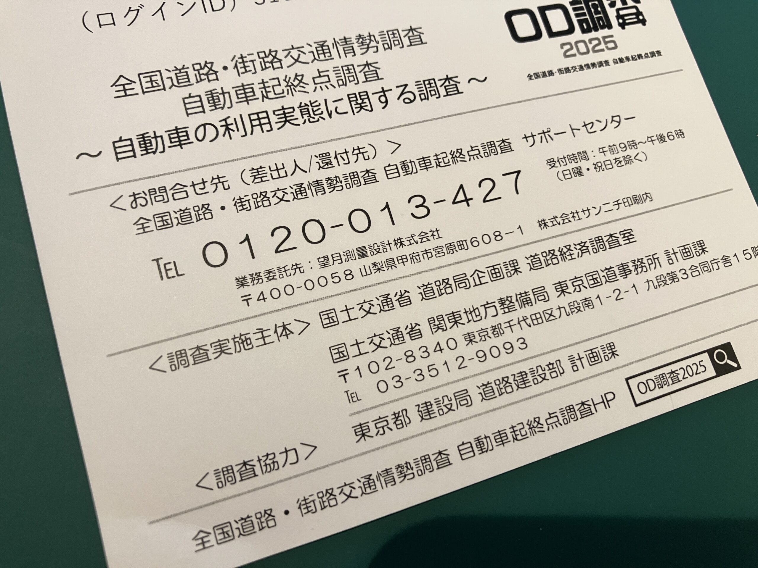 調べてみると、国土交通省が5年に一度実施している交通情勢の調査のようで、このハガキが来るまでは知らなかった。それから数日後には封筒が届き、その中身は協力依頼と回答方法の案内だった。